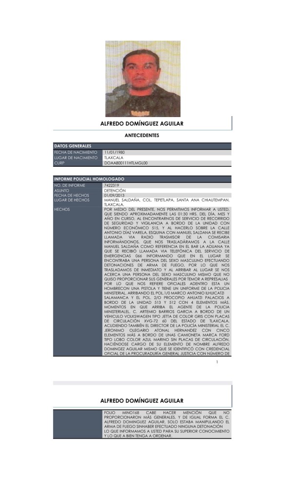 Son filtrados antecedentes penales de un policía de investigación del Estado de Tlaxcala de nombre “Alfredo Dominguez Aguilar”, dicho sujeto se encontraba en un Bar de nombre “BAR ADUANA” en la colonia Tepetlapa en Santa Ana #Chiautempan presuntamente en estado de ebriedad y con el uniforme de la policía efectuando disparos con un arma de fuego dentro del establecimiento, esto informado por medio de una llamada recibida al 066.